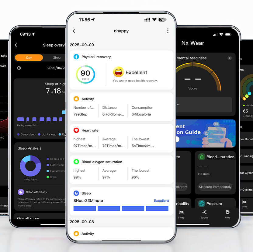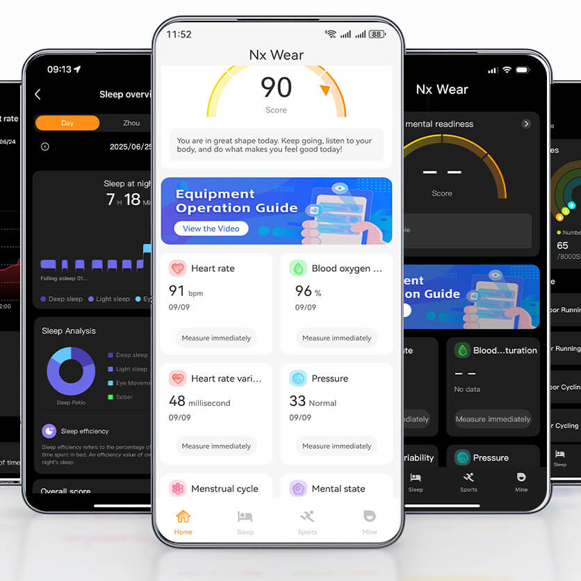 De algemene interface is overzichtelijk en de functiegroepering is duidelijk. Het bestrijkt meerdere aspecten zoals apparaatverbinding, gezondheid, sociale interactie en persoonlijke instellingen, en biedt gebruikers uitgebreide functionele ondersteuning en gemakkelijke bediening van het apparaat.
