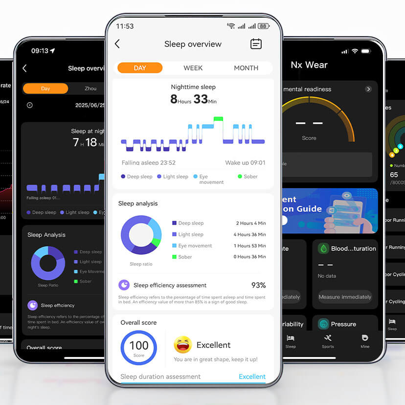 Ontdek je nachtelijke slaappatronen automatisch. Deze tracker registreert de tijd die je doorbrengt in diepe slaap, lichte slaap en wakkere fases, en geeft je een volledig beeld van je rustkwaliteit om gezondere slaaproutines te ontwikkelen.